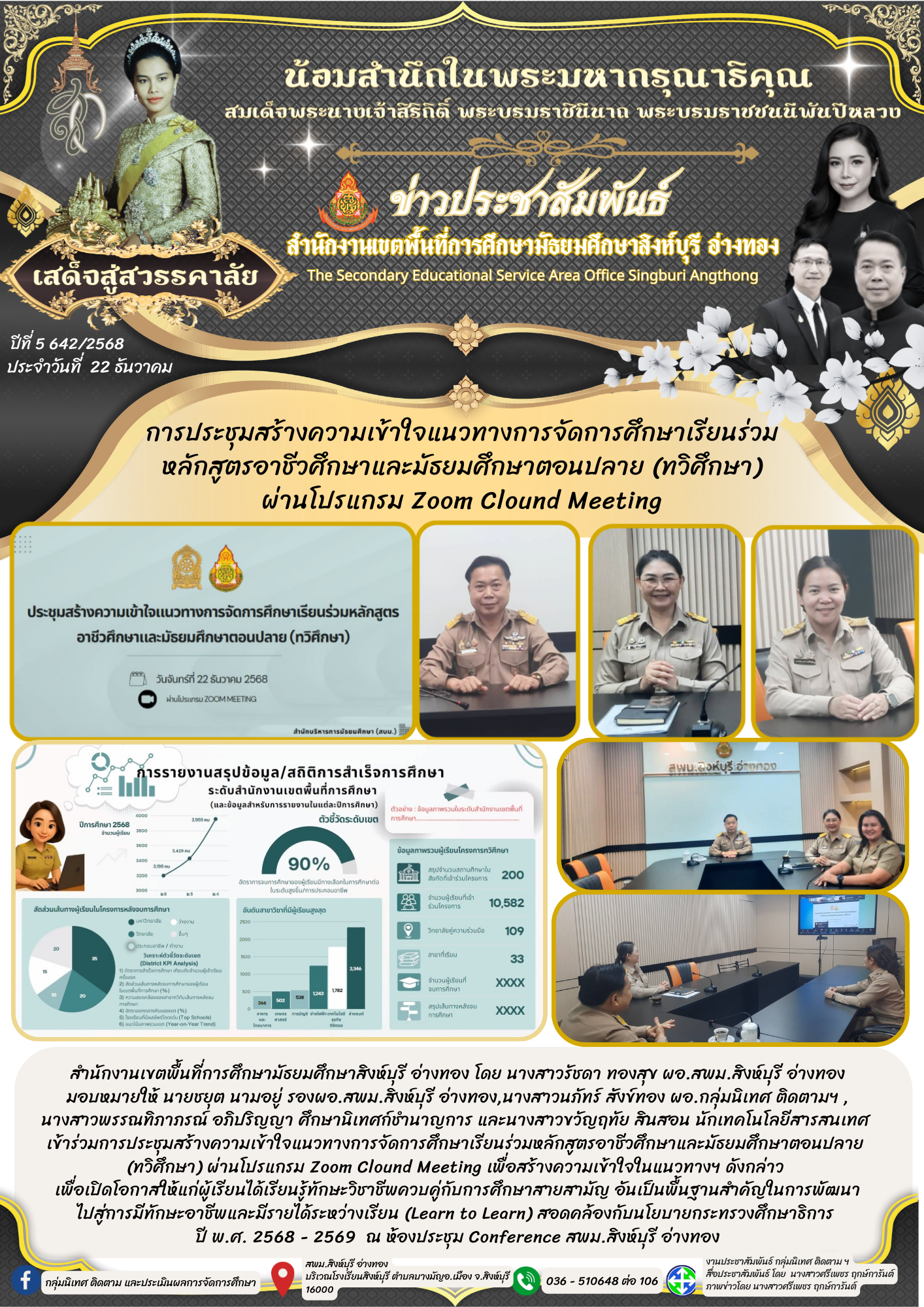 วันที่ 22 ธันวาคม 2568 การประชุมสร้างความเข้าใจแนวทางการจัดการศึกษาเรียนร่วมหลักสูตรอาชีวศึกษาและมัธยมศึกษาตอนปลาย (ทวิศึกษา) ผ่านโปรแกรม Zoom Clound Meeting
