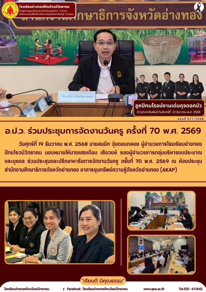 วันศุกร์ที่ 19 ธันวาคม พ.ศ. 2568 นายสมนึก จุ้ยดอนกลอย ผู้อำนวยการโรงเรียนอ่างทองปัทมโรจน์วิทยาคม มอบหมายให้นางแสงเดือน เสือวงษ์ รองผู้อำนวยการกลุ่มบริหารงบประมาณและบุคคล ร่วมประชุมและปรึกษาหารือการจัดงานวันครู ครั้งที่ 70 พ.ศ. 2569 ณ ห้องประชุมสำนักงานศึกษาธิการจังหวัดอ่างทอง อาคารขุมทรัพย์ความรู้จังหวัดอ่างทอง (AKAP)