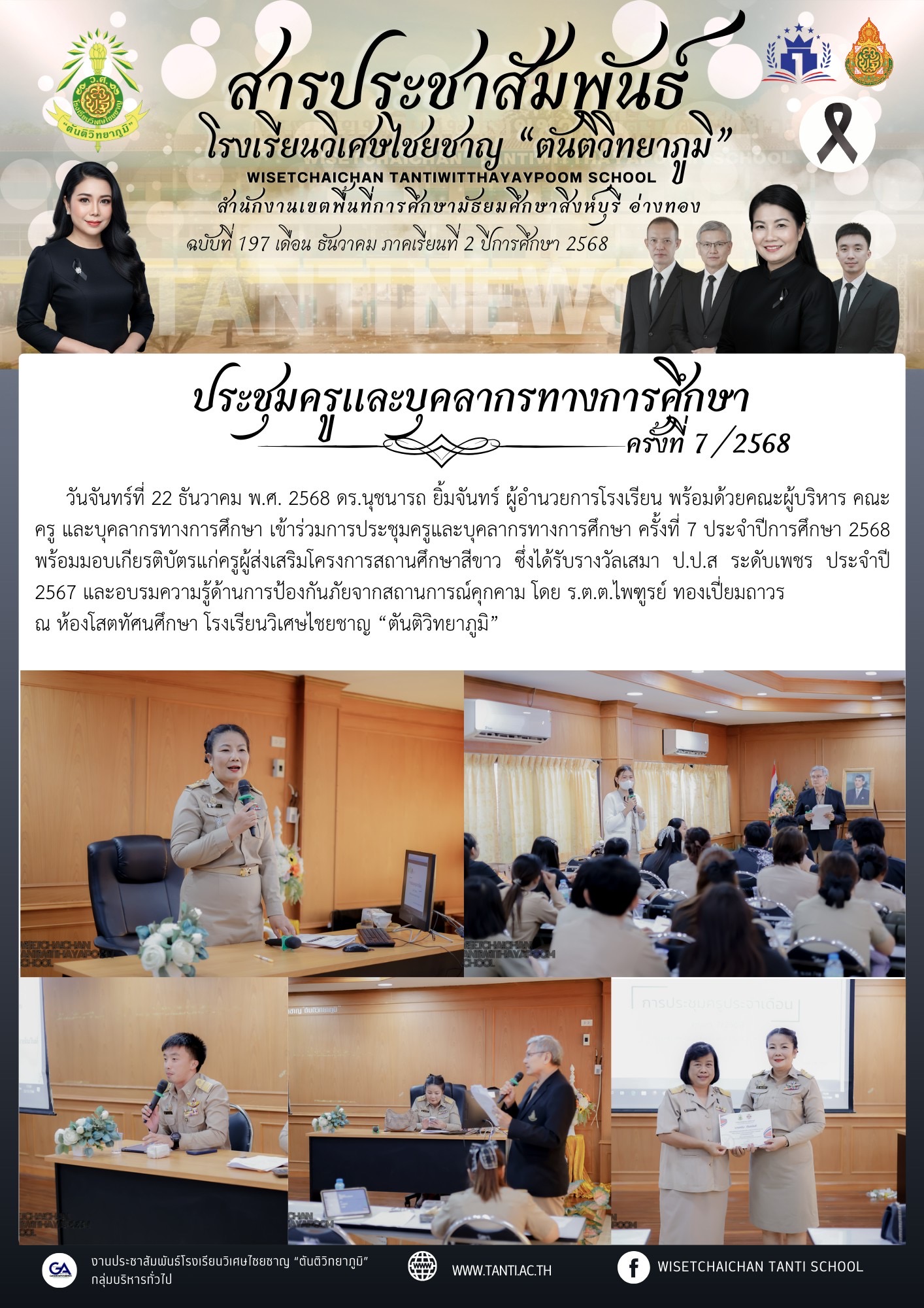 วันจันทร์ที่ 22 ธันวาคม พ.ศ. 2568 ดร.นุชนารถ ยิ้มจันทร์ ผู้อำนวยการโรงเรียน พร้อมด้วยคณะผู้บริหาร คณะครู และบุคลากรทางการศึกษา เข้าร่วมการประชุมครูและบุคลากรทางการศึกษา ครั้งที่ 7 ประจำปีการศึกษา 2568 พร้อมมอบเกียรติบัตรแก่ครูผู้ส่งเสริมโครงการสถานศึกษาสีขาว ซึ่งได้รับรางวัลเสมา ป.ป.ส ระดับเพชร ประจำปี 2567 และอบรมความรู้ด้านการป้องกันภัยจากสถานการณ์คุกคาม โดย ร.ต.ต.ไพฑูรย์ ทองเปี่ยมถาวร ณ ห้องโสตทัศนศึกษา โรงเรียนวิเศษไชยชาญ “ตันติวิทยาภูมิ”