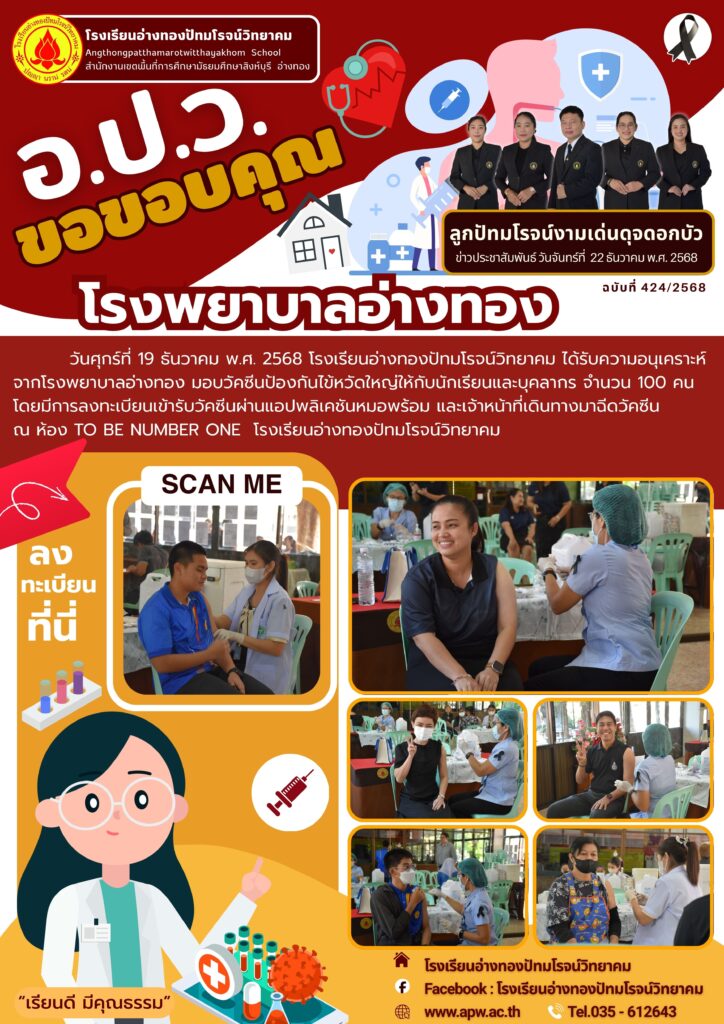วันศุกร์ที่ 19 ธันวาคม พ.ศ. 2568 โรงเรียนอ่างทองปัทมโรจน์วิทยาคม ได้รับความอนุเคราะห์จากโรงพยาบาลอ่างทอง มอบวัคซีนป้องกันไข้หวัดใหญ่ให้กับนักเรียนและบุคลากร จำนวน 100 คน โดยมีการลงทะเบียนเข้ารับวัคซีนผ่านแอปพลิเคชันหมอพร้อม และเจ้าหน้าที่เดินทางมาฉีดวัคซีน ณ ห้อง TO BE NUMBER ONE โรงเรียนอ่างทองปัทมโรจน์วิทยาคม