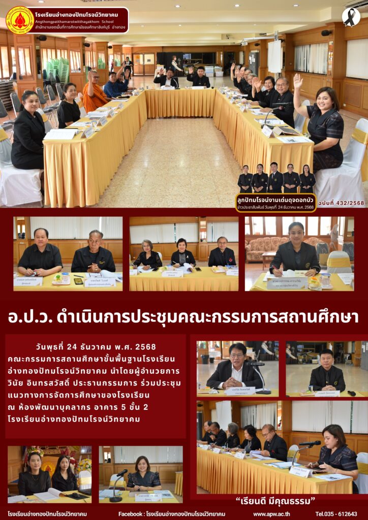 วันพุธที่ 24 ธันวาคม พ.ศ. 2568 คณะกรรมการสถานศึกษาขั้นพื้นฐานโรงเรียนอ่างทองปัทมโรจน์วิทยาคม นำโดยผู้อำนวยการวินัย อินทรสวัสดิ์ ประธานกรรมการ ร่วมประชุมแนวทางการจัดการศึกษาของโรงเรียน ณ ห้องพัฒนาบุคลากร อาคาร 5 ชั้น 2 โรงเรียนอ่างทองปัทมโรจน์วิทยาคม