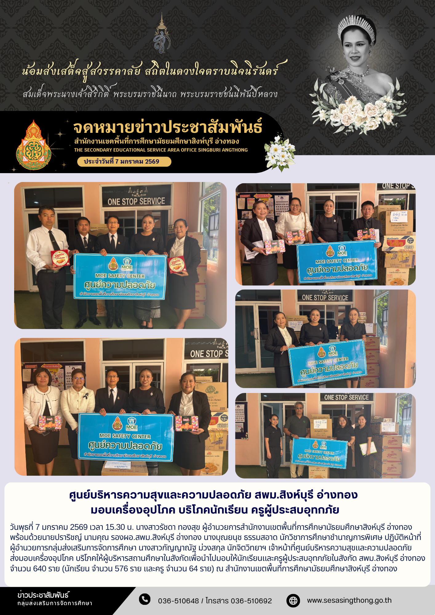 ศุนย์บริหารความสุขและความปลอดภัย สพม.สิงห์บุรี อ่างทอง มอบเครื่องอุปโภค บริโภคนักเรียน ครูผู้ประสบอุทกภัย