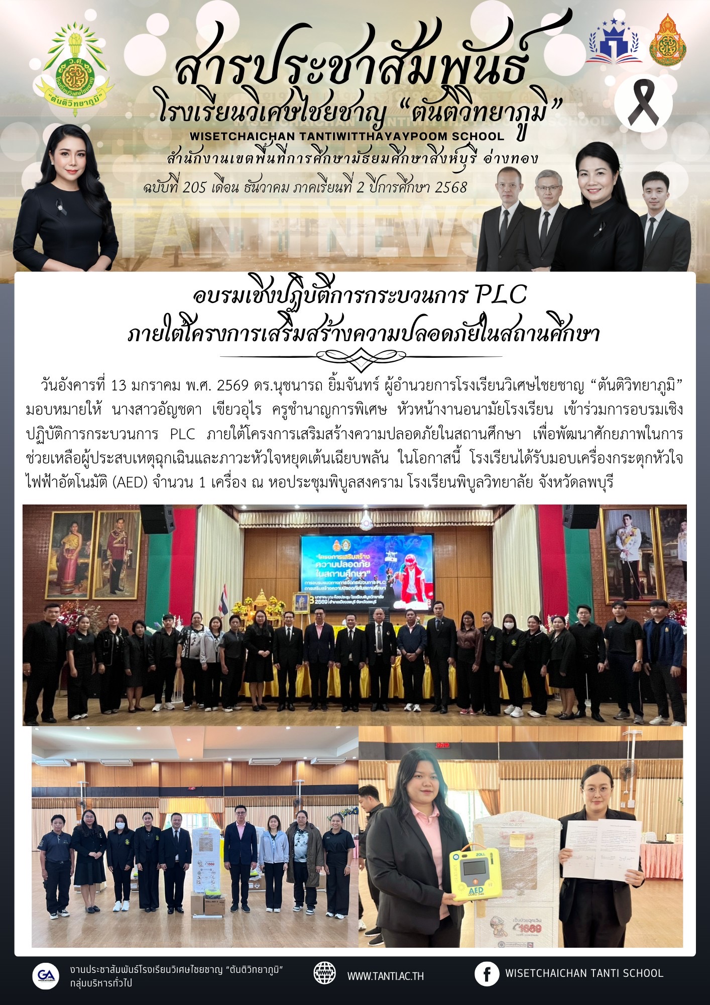วันอังคารที่ 13 มกราคม พ.ศ. 2569 ดร.นุชนารถ ยิ้มจันทร์ ผู้อำนวยการโรงเรียนวิเศษไชยชาญ “ตันติวิทยาภูมิ” มอบหมายให้ นางสาวอัญชดา เขียวอุไร ครูชำนาญการพิเศษ หัวหน้างานอนามัยโรงเรียน เข้าร่วมการอบรมเชิงปฏิบัติการกระบวนการ PLC ภายใต้โครงการเสริมสร้างความปลอดภัยในสถานศึกษา เพื่อพัฒนาศักยภาพในการช่วยเหลือผู้ประสบเหตุฉุกเฉินและภาวะหัวใจหยุดเต้นเฉียบพลัน ในโอกาสนี้ โรงเรียนได้รับมอบเครื่องกระตุกหัวใจไฟฟ้าอัตโนมัติ (AED) จำนวน 1 เครื่อง ณ หอประชุมพิบูลสงคราม โรงเรียนพิบูลวิทยาลัย จังหวัดลพบุรี