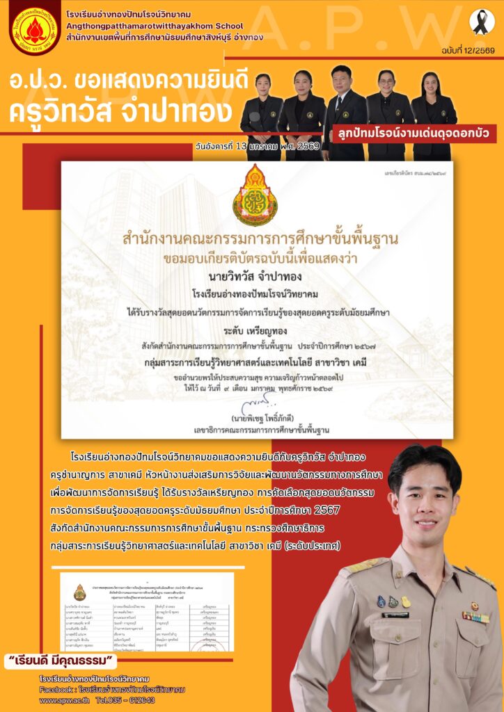 โรงเรียนอ่างทองปัทมโรจน์วิทยาคมขอแสดงความยินดีกับครูวิทวัส จำปาทอง ครูชำนาญการ สาขาเคมี หัวหน้างานส่งเสริมการวิจัยและพัฒนานวัตกรรมทางการศึกษา เพื่อพัฒนาการจัดการเรียนรู้ ได้รับรางวัลเหรียญทอง การคัดเลือกสุดยอดนวัตกรรมการจัดการเรียนรู้ของสุดยอดครูระดับมัธยมศึกษา ประจำปีการศึกษา 2567 สังกัดสำนักงานคณะกรรมการการศึกษาขั้นพื้นฐาน กระทรวงศึกษาธิการ กลุ่มสาระการเรียนรู้วิทยาศาสตร์และเทคโนโลยี สาขาวิชา เคมี (ระดับประเทศ)