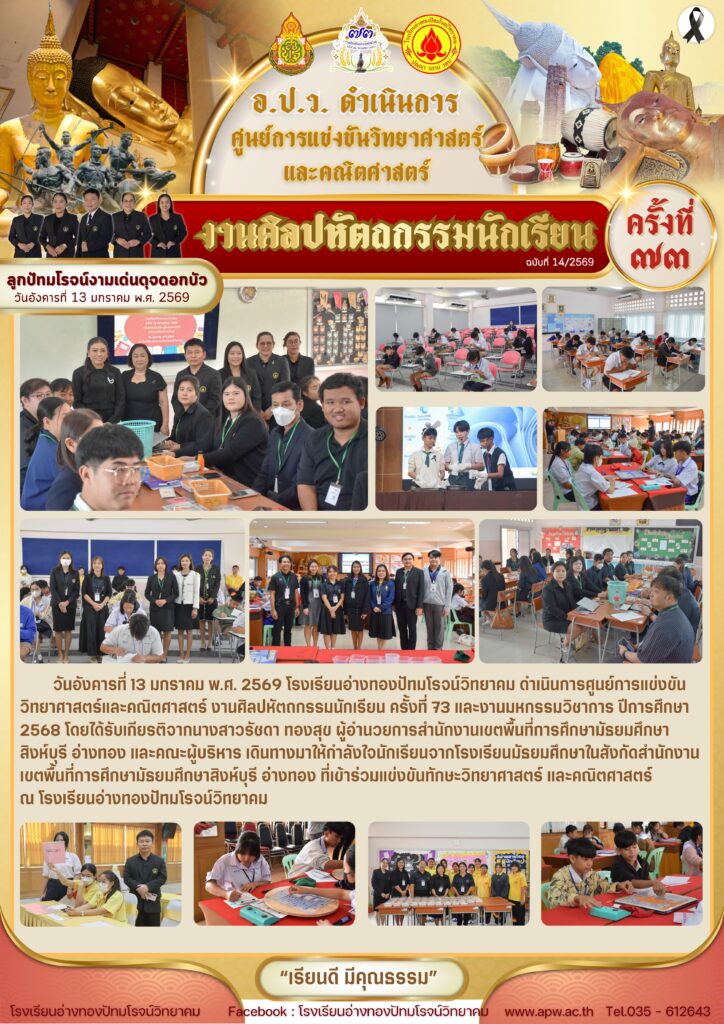 วันอังคารที่ 13 มกราคม พ.ศ. 2569 โรงเรียนอ่างทองปัทมโรจน์วิทยาคม ดำเนินการศูนย์การแข่งขันวิทยาศาสตร์และคณิตศาสตร์ งานศิลปหัตถกรรมนักเรียน ครั้งที่ 73 และงานมหกรรมวิชาการ ปีการศึกษา 2568 โดยได้รับเกียรติจากนางสาวรัชดา ทองสุข ผู้อำนวยการสำนักงานเขตพื้นที่การศึกษามัธยมศึกษาสิงห์บุรี อ่างทอง และคณะผู้บริหาร เดินทางมาให้กำลังใจนักเรียนจากโรงเรียนมัธยมศึกษาในสังกัดสำนักงานเขตพื้นที่การศึกษามัธยมศึกษาสิงห์บุรี อ่างทอง ที่เข้าร่วมแข่งขันทักษะวิทยาศาสตร์ และคณิตศาสตร์ ณ โรงเรียนอ่างทองปัทมโรจน์วิทยาคม