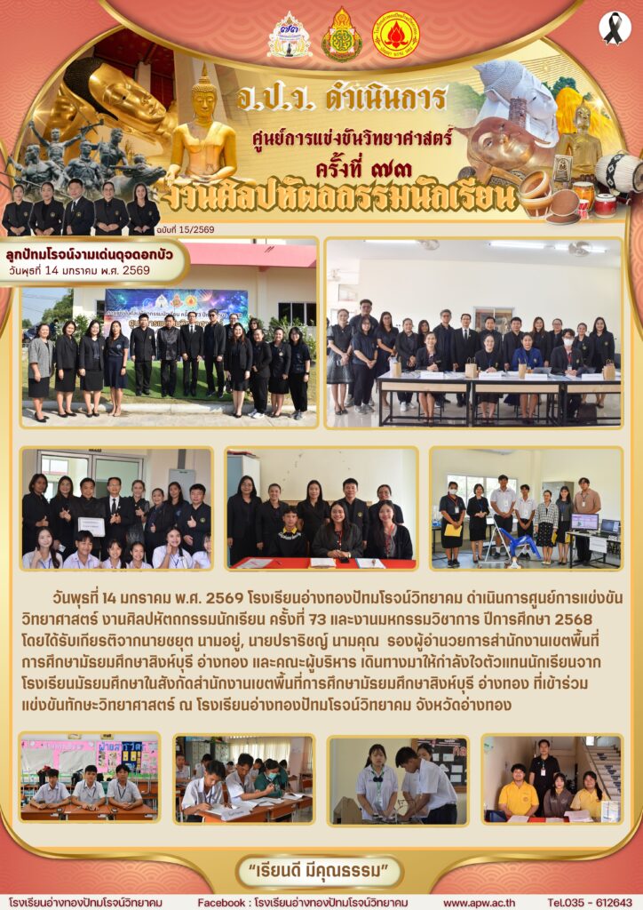 วันพุธที่ 14 มกราคม พ.ศ. 2569 โรงเรียนอ่างทองปัทมโรจน์วิทยาคม ดำเนินการศูนย์การแข่งขันวิทยาศาสตร์ งานศิลปหัตถกรรมนักเรียน ครั้งที่ 73 และงานมหกรรมวิชาการ ปีการศึกษา 2568 โดยได้รับเกียรติจากนายชยุต นามอยู่, นายปราริชญ์ นามคุณ รองผู้อำนวยการสำนักงานเขตพื้นที่การศึกษามัธยมศึกษาสิงห์บุรี อ่างทอง และคณะผู้บริหาร เดินทางมาให้กำลังใจตัวแทนนักเรียนจากโรงเรียนมัธยมศึกษาในสังกัดสำนักงานเขตพื้นที่การศึกษามัธยมศึกษาสิงห์บุรี อ่างทอง ที่เข้าร่วมแข่งขันทักษะวิทยาศาสตร์ ณ โรงเรียนอ่างทองปัทมโรจน์วิทยาคม จังหวัดอ่างทอง