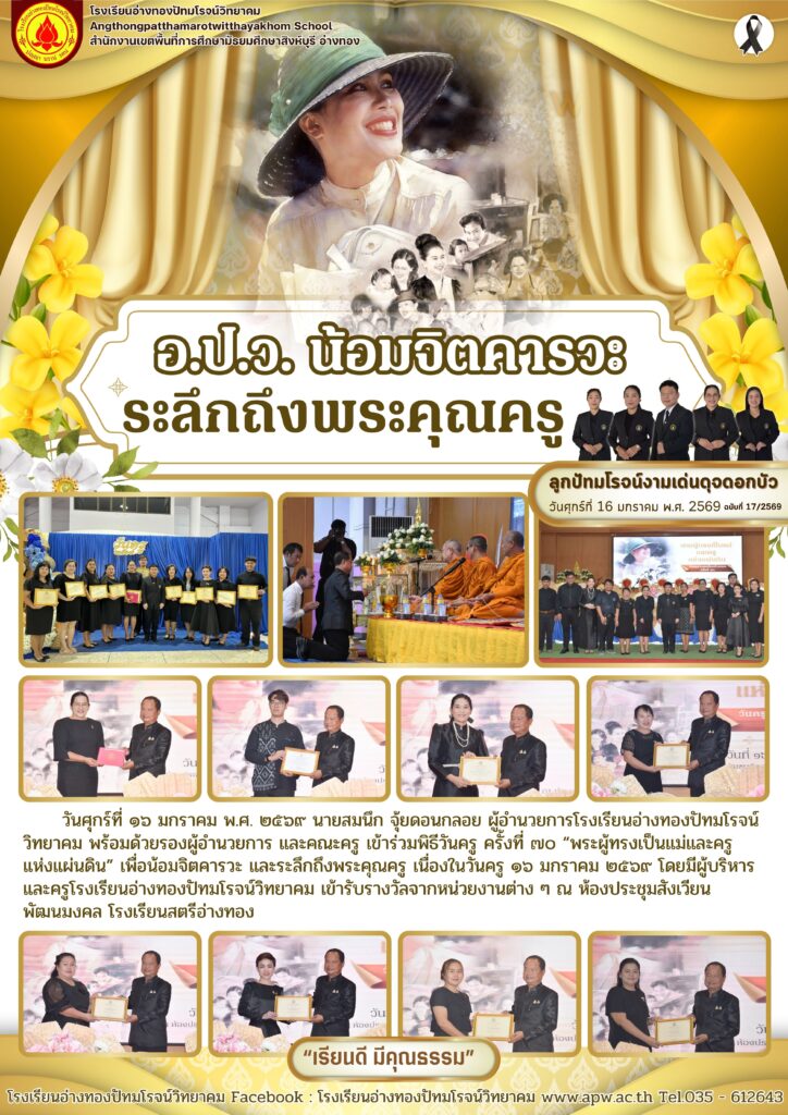 วันศุกร์ที่ ๑๖ มกราคม พ.ศ. ๒๕๖๙ นายสมนึก จุ้ยดอนกลอย ผู้อำนวยการโรงเรียนอ่างทองปัทมโรจน์วิทยาคม พร้อมด้วยรองผู้อำนวยการ และคณะครู เข้าร่วมพิธีวันครู ครั้งที่ ๗๐ “พระผู้ทรงเป็นแม่และครูแห่งแผ่นดิน” เพื่อน้อมจิตคารวะ และระลึกถึงพระคุณครู เนื่องในวันครู ๑๖ มกราคม ๒๕๖๙ โดยมีผู้บริหารและครูโรงเรียนอ่างทองปัทมโรจน์วิทยาคม เข้ารับรางวัลจากหน่วยงานต่าง ๆ ณ ห้องประชุมสังเวียนพัฒนมงคล โรงเรียนสตรีอ่างทอง