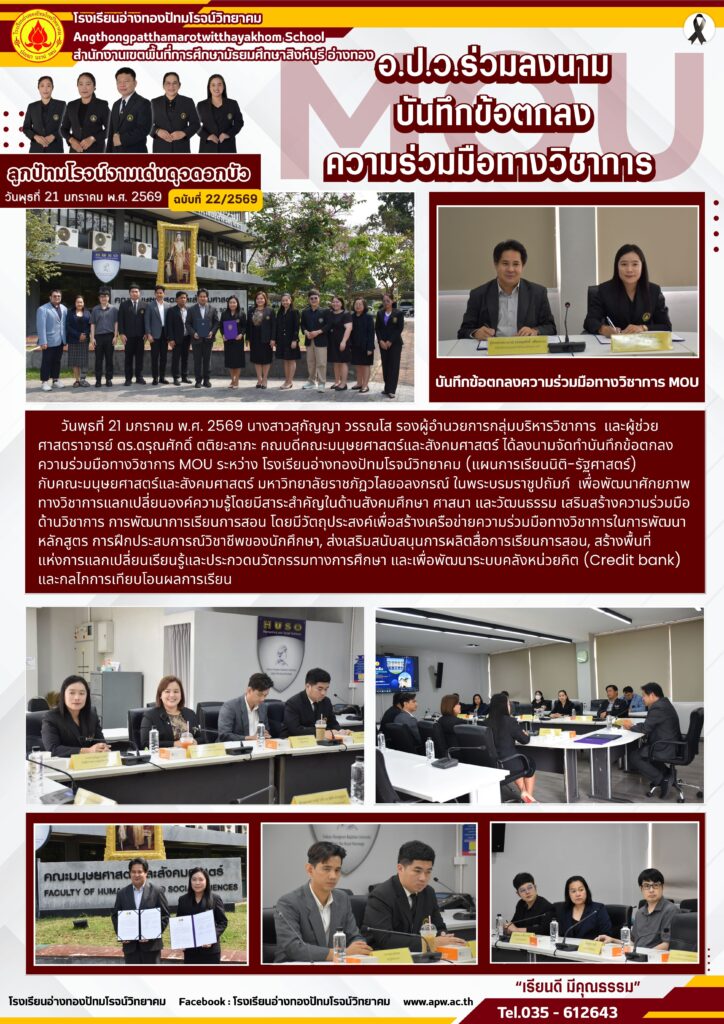 วันพุธที่ 21 มกราคม พ.ศ. 2569 นางสาวสุกัญญา วรรณโส รองผู้อำนวยการกลุ่มบริหารวิชาการ และผู้ช่วยศาสตราจารย์ ดร.ดรุณศักดิ์ ตติยะลาภะ คณบดีคณะมนุษยศาสตร์และสังคมศาสตร์ ได้ลงนามจัดทำบันทึกข้อตกลงความร่วมมือทางวิชาการMOU ระหว่าง โรงเรียนอ่างทองปัทมโรจน์วิทยาคม (แผนการเรียนนิติ-รัฐศาสตร์) กับคณะมนุษยศาสตร์และสังคมศาสตร์ มหาวิทยาลัยราชภัฏวไลยอลงกรณ์ ในพระบรมราชูปถัมภ์ เพื่อพัฒนาศักยภาพทางวิชาการแลกเปลี่ยนองค์ความรู้โดยมีสาระสำคัญในด้านสังคมศึกษา ศาสนา และวัฒนธรรม เสริมสร้างความร่วมมือด้านวิชาการ การพัฒนาการเรียนการสอน โดยมีวัตถุประสงค์เพื่อสร้างเครือข่ายความร่วมมือทางวิชาการในการพัฒนาหลักสูตร การฝึกประสบการณ์วิชาชีพของนักศึกษา, ส่งเสริมสนับสนุนการผลิตสื่อการเรียนการสอน, สร้างพื้นที่แห่งการแลกเปลี่ยนเรียนรู้และประกวดนวัตกรรมทางการศึกษา และเพื่อพัฒนาระบบคลังหน่วยกิต (Credit bank) และกลไกการเทียบโอนผลการเรียน