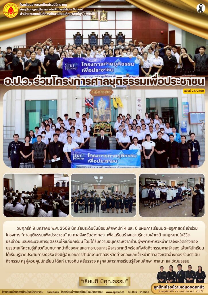 วันศุกร์ที่ 9 มกราคม พ.ศ. 2569 นักเรียนระดับชั้นมัธยมศึกษาปีที่ 4 และ 6 แผนการเรียนนิติ–รัฐศาสตร์ เข้าร่วมโครงการ “ศาลยุติธรรมเพื่อประชาชน”ณ ศาลจังหวัดอ่างทอง เพื่อเสริมสร้างความรู้ความเข้าใจด้านกฎหมายในชีวิตประจำวัน และกระบวนการยุติธรรมให้แก่นักเรียน โดยได้รับความอนุเคราะห์จากท่านผู้พิพากษาหัวหน้าศาลจังหวัดอ่างทอง บรรยายให้ความรู้เกี่ยวกับบทบาทหน้าที่ของศาลและกระบวนการพิจารณาคดี พร้อมทั้งจัดกิจกรรมศาลจำลอง เพื่อให้นักเรียนได้เรียนรู้จากประสบการณ์จริง ซึ่งมีผู้อำนวยการสำนักงานศาลจังหวัดอ่างทองและเจ้าหน้าที่ศาลจังหวัดอ่างทองร่วมดำเนินกิจกรรม ครูผู้ควบคุมนักเรียน ได้แก่ นายวศิน ศรีบรรจง ครูกลุ่มสาระการเรียนรู้สังคมศึกษา ศาสนา และวัฒนธรรม