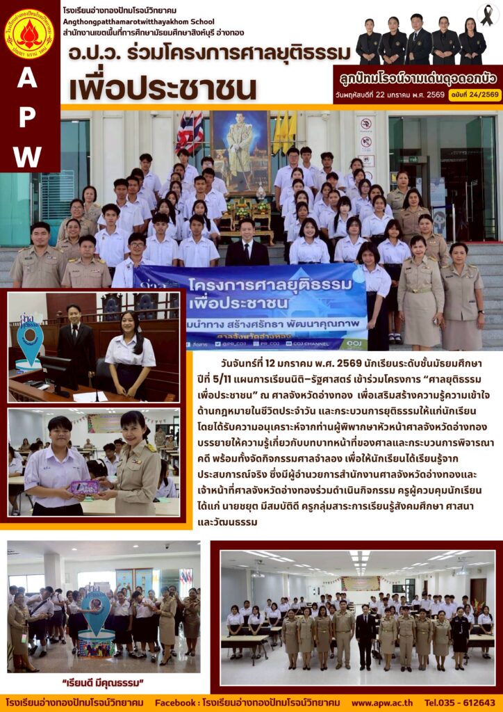 วันจันทร์ที่ 12 มกราคม พ.ศ. 2569 นักเรียนระดับชั้นมัธยมศึกษาปีที่ 5/11 แผนการเรียนนิติ–รัฐศาสตร์ เข้าร่วมโครงการ “ศาลยุติธรรมเพื่อประชาชน” ณ ศาลจังหวัดอ่างทอง เพื่อเสริมสร้างความรู้ความเข้าใจด้านกฎหมายในชีวิตประจำวัน และกระบวนการยุติธรรมให้แก่นักเรียนโดยได้รับความอนุเคราะห์จากท่านผู้พิพากษาหัวหน้าศาลจังหวัดอ่างทอง บรรยายให้ความรู้เกี่ยวกับบทบาทหน้าที่ของศาลและกระบวนการพิจารณาคดี พร้อมทั้งจัดกิจกรรมศาลจำลอง เพื่อให้นักเรียนได้เรียนรู้จากประสบการณ์จริง ซึ่งมีผู้อำนวยการสำนักงานศาลจังหวัดอ่างทองและ