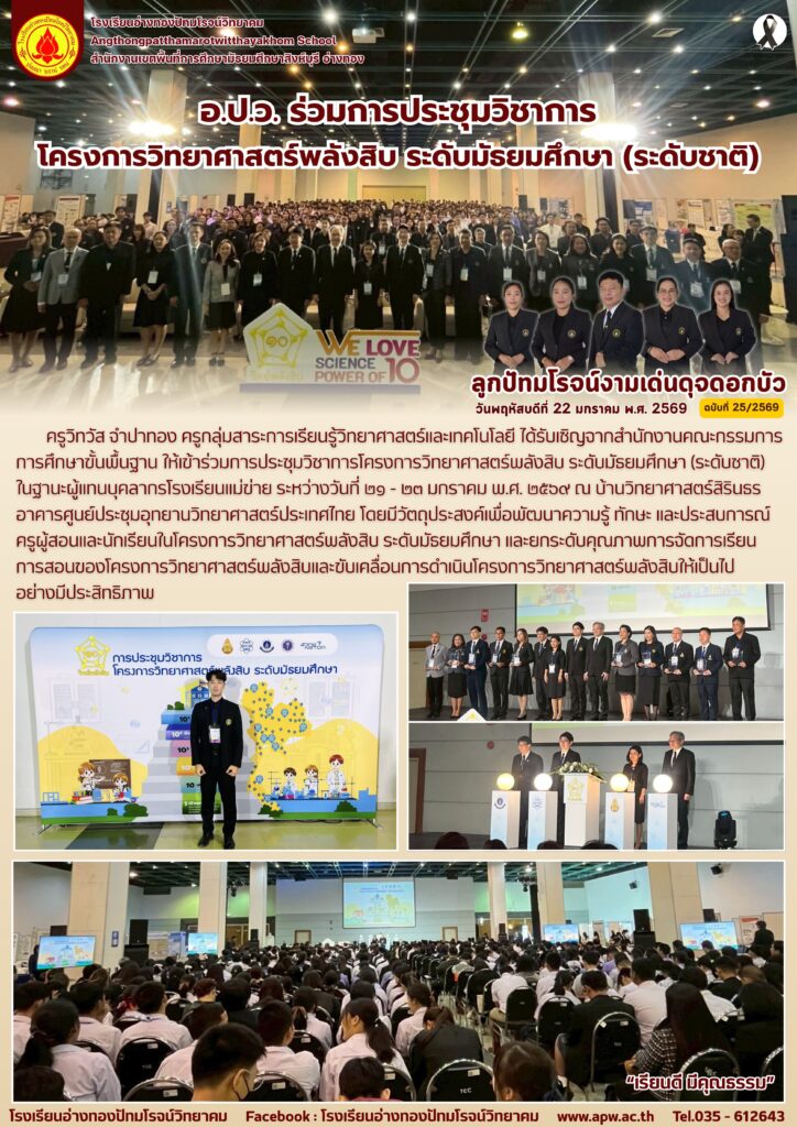 ครูวิทวัส จำปาทอง ครูกลุ่มสาระการเรียนรู้วิทยาศาสตร์และเทคโนโลยี ได้รับเชิญจากสำนักงานคณะกรรมการการศึกษาขั้นพื้นฐาน ให้เข้าร่วมการประชุมวิชาการโครงการวิทยาศาสตร์พลังสิบ ระดับมัธยมศึกษา (ระดับชาติ) ในฐานะผู้แทนบุคลากรโรงเรียนแม่ข่าย ระหว่างวันที่ ๒๑ – ๒๓ มกราคม พ.ศ. ๒๕๖๙ ณ บ้านวิทยาศาสตร์สิรินธร อาคารศูนย์ประชุมอุทยานวิทยาศาสตร์ประเทศไทย โดยมีวัตถุประสงค์เพื่อพัฒนาความรู้ ทักษะ และประสบการณ์ครูผู้สอนและนักเรียนในโครงการวิทยาศาสตร์พลังสิบ ระดับมัธยมศึกษา และยกระดับคุณภาพการจัดการเรียนการสอนของโครงการวิทยาศาสตร์พลังสิบและขับเคลื่อนการดำเนินโครงการวิทยาศาสตร์พลังสิบให้เป็นไปอย่างมีประสิทธิภาพ