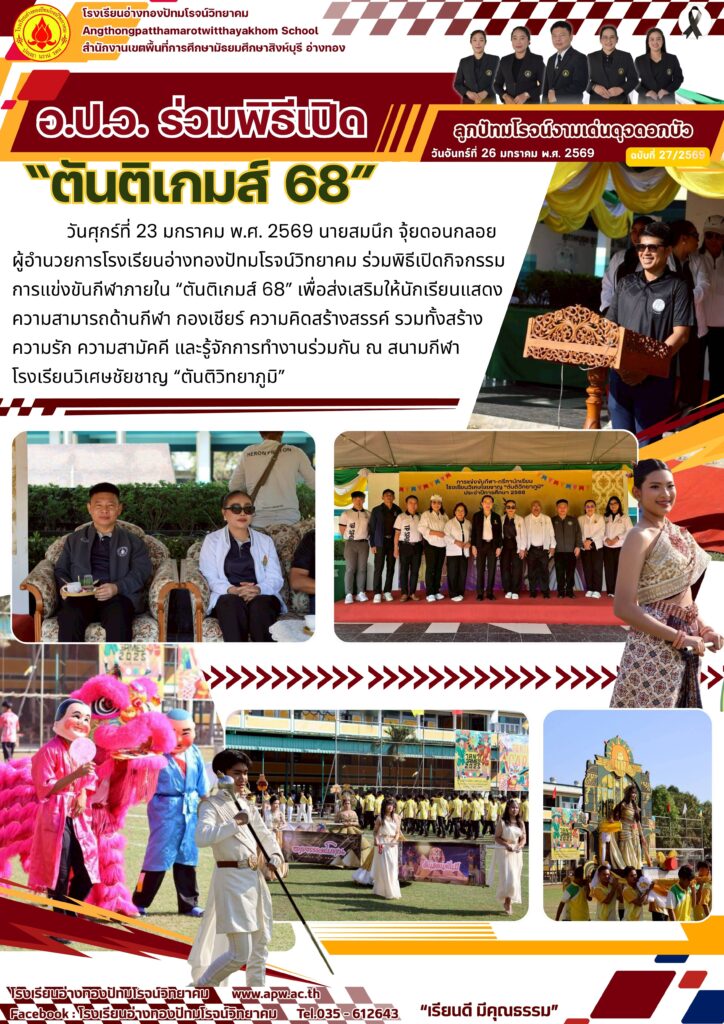 วันศุกร์ที่ 23 มกราคม พ.ศ. 2569 นายสมนึก จุ้ยดอนกลอย ผู้อำนวยการโรงเรียนอ่างทองปัทมโรจน์วิทยาคม ร่วมพิธีเปิดกิจกรรมการแข่งขันกีฬาภายใน “ตันติเกมส์ 68” เพื่อส่งเสริมให้นักเรียนแสดงความสามารถด้านกีฬา กองเชียร์ ความคิดสร้างสรรค์ รวมทั้งสร้างความรัก ความสามัคคี และรู้จักการทำงานร่วมกัน ณ สนามกีฬาโรงเรียนวิเศษชัยชาญ “ตันติวิทยาภูมิ”