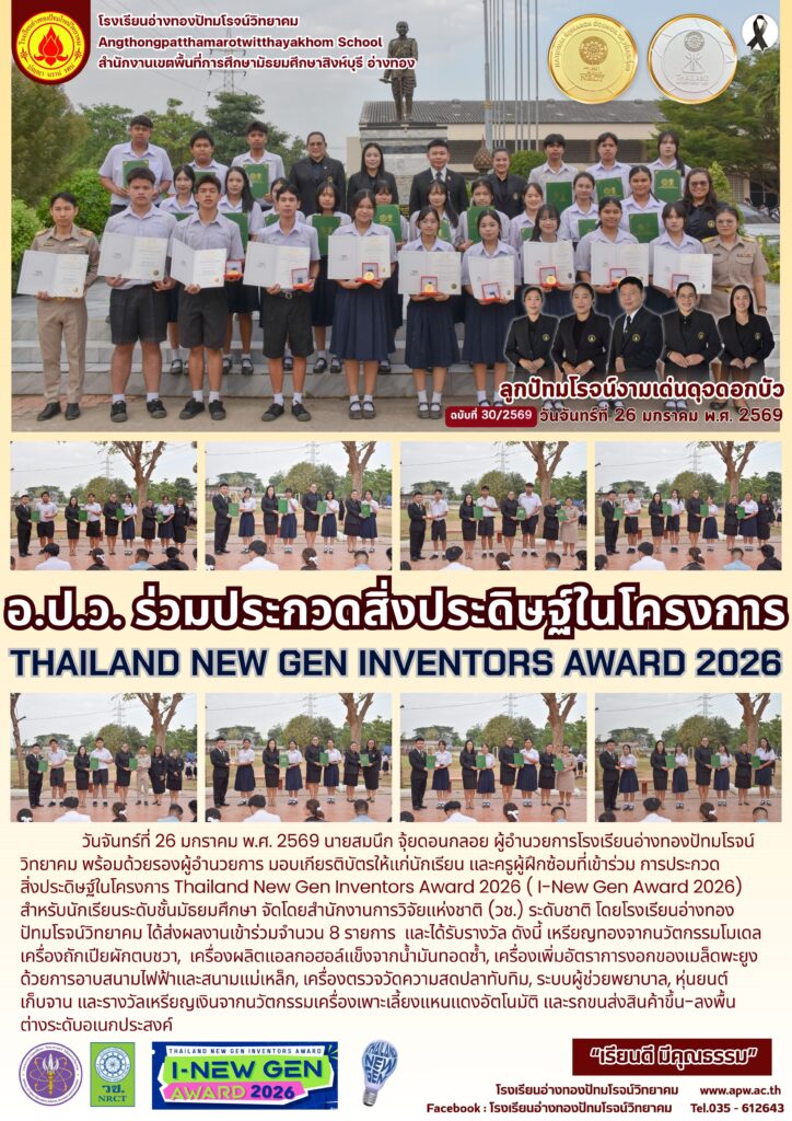 วันจันทร์ที่ 26 มกราคม พ.ศ. 2569 นายสมนึก จุ้ยดอนกลอย ผู้อำนวยการโรงเรียนอ่างทองปัทมโรจน์วิทยาคม พร้อมด้วยรองผู้อำนวยการ มอบเกียรติบัตรให้แก่นักเรียน และครูผู้ฝึกซ้อมที่เข้าร่วม การประกวดสิ่งประดิษฐ์ในโครงการ Thailand New Gen Inventors Award 2026 ( I-New Gen Award 2026) สำหรับนักเรียนระดับชั้นมัธยมศึกษา จัดโดยสำนักงานการวิจัยแห่งชาติ (วช.) ระดับชาติ โดยโรงเรียนอ่างทองปัทมโรจน์วิทยาคม ได้ส่งผลงานเข้าร่วมจำนวน 8 รายการ และได้รับรางวัล ดังนี้ เหรียญทองจากนวัตกรรมโมเดลเครื่องถักเปียผักตบชวา, เครื่องผลิตแอลกอฮอล์แข็งจากน้ำมันทอดซ้ำ, เครื่องเพิ่มอัตราการงอกของเมล็ดพะยูงด้วยการอาบสนามไฟฟ้าและสนามแม่เหล็ก, เครื่องตรวจวัดความสดปลาทับทิม, ระบบผู้ช่วยพยาบาล, หุ่นยนต์เก็บจาน และรางวัลเหรียญเงินจากนวัตกรรมเครื่องเพาะเลี้ยงแหนแดงอัตโนมัติ และรถขนส่งสินค้าขึ้น-ลงพื้นต่างระดับอเนกประสงค์