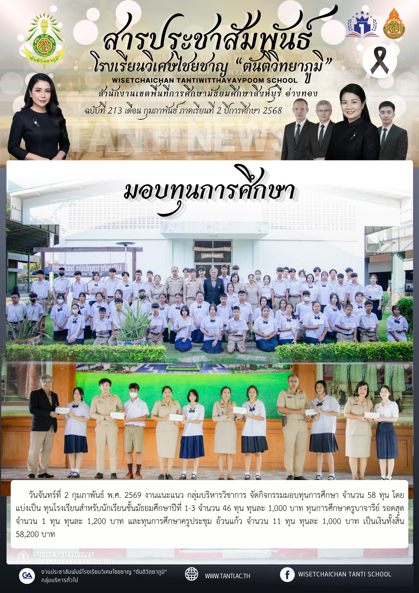 วันจันทร์ที่ 2 กุมภาพันธ์ พ.ศ. 2569 งานแนะแนว กลุ่มบริหารวิชาการ จัดกิจกรรมมอบทุนการศึกษา จำนวน 58 ทุน โดยแบ่งเป็น ทุนโรงเรียนสำหรับนักเรียนชั้นมัธยมศึกษาปีที่ 1-3 จำนวน 46 ทุน ทุนละ 1,000 บาท ทุนการศึกษาครูบาจารีย์ รอดสุด จำนวน 1 ทุน ทุนละ 1,200 บาท และทุนการศึกษาครูประชุม อ้วนแก้ว จำนวน 11 ทุน ทุนละ 1,000 บาท เป็นเงินทั้งสิ้น 58,200 บาท