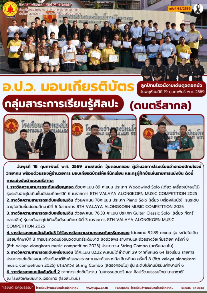 วันพุธที่ 18 กุมภาพันธ์ พ.ศ. 2569 นายสมนึก จุ้ยดอนกลอย ผู้อำนวยการโรงเรียนอ่างทองปัทมโรจน์วิทยาคม พร้อมด้วยรองผู้อำนวยการ มอบเกียรติบัตรให้แก่นักเรียน และครูผู้ฝึกซ้อมในรายการแข่งขัน ดังนี้