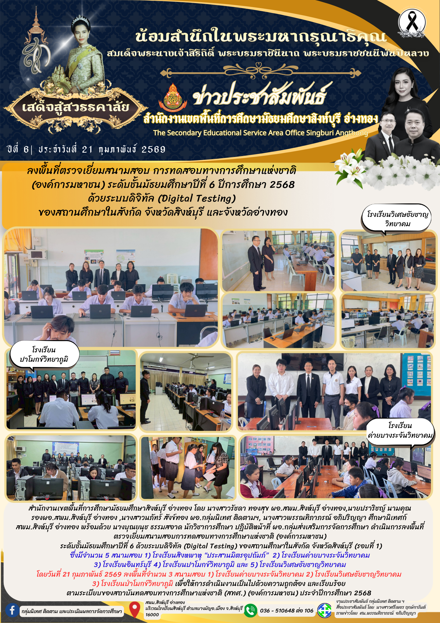 ลงพื้นที่ตรวจเยี่ยมสนามสอบ การทดสอบทางการศึกษาแห่งชาติ (องค์การมหาชน) ระดับชั้นมัธยมศึกษาปีที่ 6 ปีการศึกษา 2568 ด้วยระบบดิจิทัล (Digital Testing) ของสถานศึกษาในสังกัด จังหวัดสิงห์บุรี และจังหวัดอ่างทอง