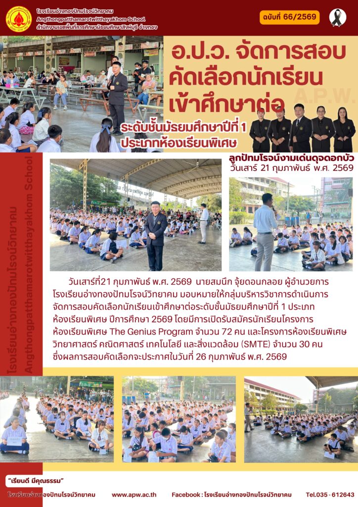 วันเสาร์ที่21 กุมภาพันธ์ พ.ศ. 2569 นายสมนึก จุ้ยดอนกลอย ผู้อำนวยการ โรงเรียนอ่างทองปัทมโรจน์วิทยาคม มอบหมายให้กลุ่มบริหารวิชาการดำเนินการจัดการสอบคัดเลือกนักเรียนเข้าศึกษาต่อระดับชั้นมัธยมศึกษาปีที่ 1 ประเภทห้องเรียนพิเศษ ปีการศึกษา 2569 โดยมีการเปิดรับสมัครนักเรียนโครงการห้องเรียนพิเศษ The Genius Program จำนวน 72 คน และโครงการห้องเรียนพิเศษวิทยาศาสตร์ คณิตศาสตร์ เทคโนโลยี และสิ่งแวดล้อม (SMTE) จำนวน 30 คน ซึ่งผลการสอบคัดเลือกจะประกาศในวันที่ 26 กุมภาพันธ์ พ.ศ. 2569