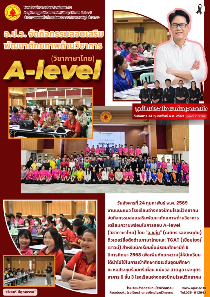 จัดกิจกรรมสอนเสริมพัฒนาศักยภาพด้านวิชาการ เตรียมความพร้อมในการสอบ A-level (วิชาภาษาไทย) โดย “อ.ขลุ่ย” (ณภัทร รอดเหตุภัย) ติวเตอร์ชื่อดังด้านภาษาไทยและ TGAT (เชื่อมโยง/เชาวน์) สำหรับนักเรียนชั้นมัธยมศึกษาปีที่ 6 ปีการศึกษา 2568 เพื่อเพิ่มทักษะความรู้ให้นักเรียนได้นำไปใช้ในการเข้าศึกษาต่อระดับอุดมศึกษา ณ หอประชุมร้อยตรีเผื่อนแม่นวล สาตมูลและบุตร อาคาร 6 ชั้น 3 โรงเรียนอ่างทองปัทมโรจน์วิทยาคม