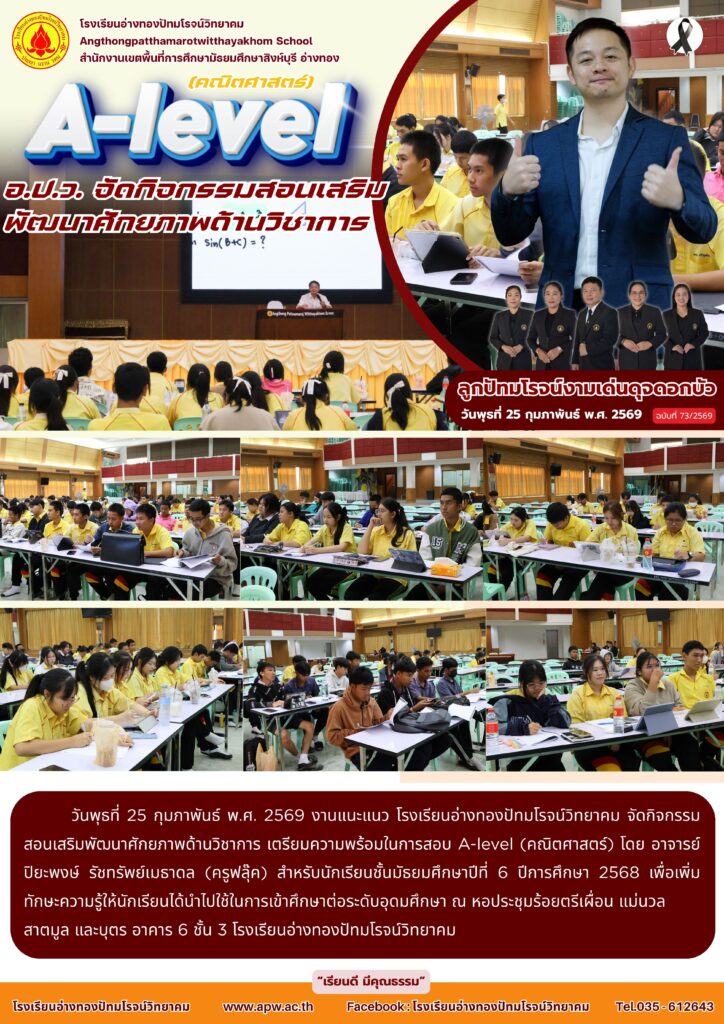 วันพุธที่ 25 กุมภาพันธ์ พ.ศ. 2569งานแนะแนว โรงเรียนอ่างทองปัทมโรจน์วิทยาคมจัดกิจกรรมสอนเสริมพัฒนาศักยภาพด้านวิชาการ เตรียมความพร้อมในการสอบ A-level(คณิตศาสตร์) โดยอาจารย์ปิยะพงษ์ รัชทรัพย์เมธาดล (ครูฟลุ๊ค) สำหรับนักเรียนชั้นมัธยมศึกษาปีที่ 6ปีการศึกษา 2568 เพื่อเพิ่มทักษะความรู้ให้นักเรียนได้นำไปใช้ในการเข้าศึกษาต่อระดับอุดมศึกษาณ หอประชุมร้อยตรีเผื่อน แม่นวล สาตมูล และบุตร อาคาร 6 ชั้น 3 โรงเรียนอ่างทองปัทมโรจน์วิทยาคม