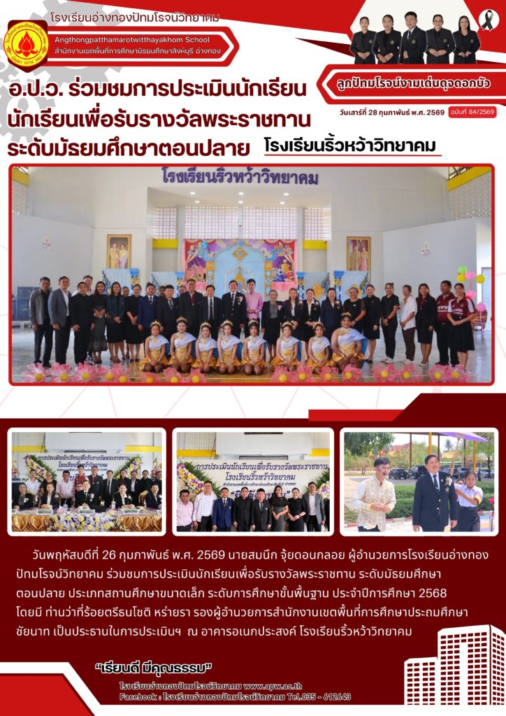 วันพฤหัสบดีที่ 26 กุมภาพันธ์ พ.ศ. 2569 นายสมนึก จุ้ยดอนกลอย ผู้อำนวยการโรงเรียนอ่างทองปัทมโรจน์วิทยาคม ร่วมชมการประเมินนักเรียนเพื่อรับรางวัลพระราชทาน ระดับมัธยมศึกษาตอนปลาย ประเภทสถานศึกษาขนาดเล็ก ระดับการศึกษาขั้นพื้นฐาน ประจำปีการศึกษา 2568 โดยมี ท่านว่าที่ร้อยตรีธนโชติ หร่ายรา รองผู้อำนวยการสำนักงานเขตพื้นที่การศึกษาประถมศึกษาชัยนาท เป็นประธานในการประเมินฯ ณ อาคารอเนกประสงค์ โรงเรียนริ้วหว้าวิทยาคม