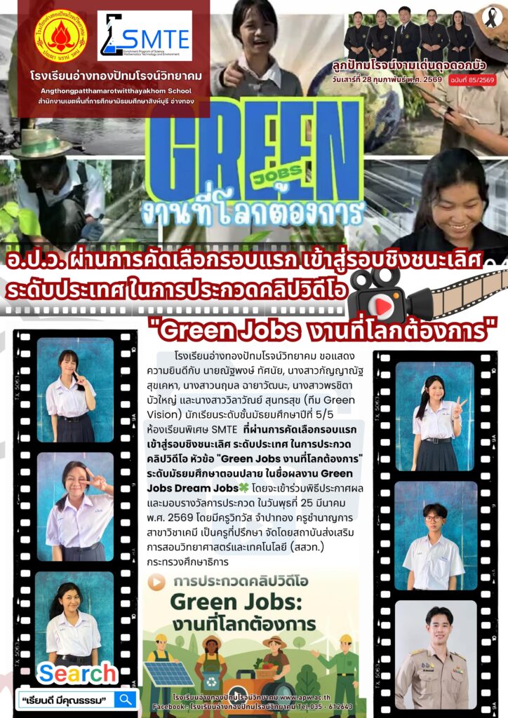 โรงเรียนอ่างทองปัทมโรจน์วิทยาคม ขอแสดงความยินดีกับ นายณัฐพงษ์ ทัศนัย, นางสาวกัญญาณัฐ สุขเคหา, นางสาวนฤมล ฉายาวัฒนะ, นางสาวพรชิตา บัวใหญ่ และนางสาววิลาวัณย์ สุนทรสุข (ทีม Green Vision) นักเรียนระดับชั้นมัธยมศึกษาปีที่ 5/5 ห้องเรียนพิเศษ SMTE ที่ผ่านการคัดเลือกรอบแรกเข้าสู่รอบชิงชนะเลิศ ระดับประเทศ ในการประกวดคลิปวิดีโอ หัวข้อ “Green Jobs งานที่โลกต้องการ” ระดับมัธยมศึกษาตอนปลาย ในชื่อผลงาน Green Jobs Dream Jobs🍀 โดยจะเข้าร่วมพิธีประกาศผลและมอบรางวัลการประกวด ในวันพุธที่ 25 มีนาคม พ.ศ. 2569 โดยมีครูวิทวัส จำปาทอง ครูชำนาญการ สาขาวิชาเคมี เป็นครูที่ปรึกษา จัดโดยสถาบันส่งเสริมการสอนวิทยาศาสตร์และเทคโนโลยี (สสวท.) กระทรวงศึกษาธิการ