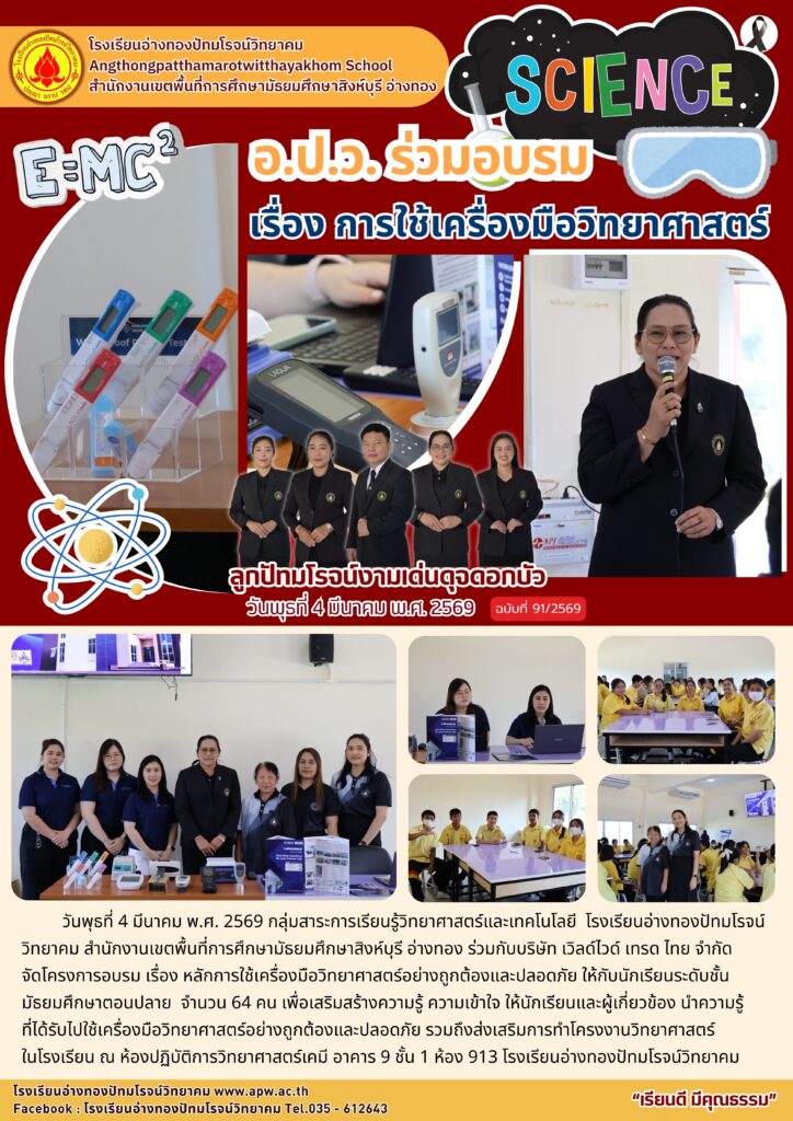 วันพุธที่ 4 มีนาคม พ.ศ. 2569 กลุ่มสาระการเรียนรู้วิทยาศาสตร์และเทคโนโลยี โรงเรียนอ่างทองปัทมโรจน์วิทยาคมสำนักงานเขตพื้นที่การศึกษามัธยมศึกษาสิงห์บุรี อ่างทองร่วมกับบริษัท เวิลด์ไวด์เทรด ไทย จำกัด จัดโครงการอบรม เรื่อง หลักการใช้เครื่องมือวิทยาศาสตร์อย่างถูกต้องและปลอดภัย ให้กับนักเรียนระดับชั้นมัธยมศึกษาตอนปลาย จำนวน 64 คน เพื่อเสริมสร้างความรู้ ความเข้าใจ ให้นักเรียนและผู้เกี่ยวข้อง นำความรู้ที่ได้รับไปใช้เครื่องมือวิทยาศาสตร์อย่างถูกต้องและปลอดภัย รวมถึงส่งเสริมการทำโครงงานวิทยาศาสตร์ในโรงเรียน ณ ห้องปฏิบัติการวิทยาศาสตร์เคมี อาคาร 9 ชั้น 1 ห้อง 913 โรงเรียนอ่างทองปัทมโรจน์วิทยาคม