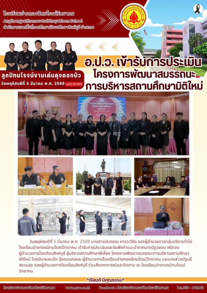วันพฤหัสบดีที่ 5 มีนาคม พ.ศ. 2569 นางสาวปรวรรณ คารวะวิชัย รองผู้อำนวยการกลุ่มบริหารทั่วไป โรงเรียนอ่างทองปัทมโรจน์วิทยาคม เข้ารับการประเมินและรับฟังคำแนะนำจากนางนัฐวรรณ ศรีทองผู้อำนวยการโรงเรียนสิงห์บุรี ผู้บริหารสถานศึกษาพี่เลี้ยง โครงการพัฒนาสมรรถนะการบริหารสถานศึกษามิติใหม่ โดยมีนายสมนึก จุ้ยดอนกลอย ผู้อำนวยการโรงเรียนอ่างทองปัทมโรจน์วิทยาคม และนางสาวณัฐนรี สงวนสุข รองผู้อำนวยการโรงเรียนสิงห์บุรี ร่วมสังเกตการณ์และติดตาม ณ โรงเรียนอ่างทองปัทมโรจน์วิทยาคม