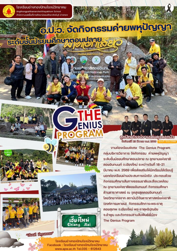 งานห้องเรียนพิเศษ The Genius Program กลุ่มบริหารวิชาการ จัดกิจกรรม ค่ายพหุปัญญา ระดับชั้นมัธยมศึกษาตอนปลาย ณ อุทยานแห่งชาติดอยอินทนนท์ จ.เชียงใหม่ ระหว่างวันที่ 18-21