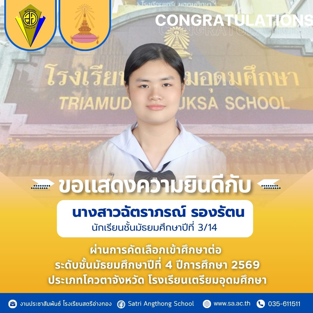 ขอแสดงความยินดีกับ นางสาวฉัตราภรณ์ รองรัตน นักเรียนโรงเรียนสตรีอ่างทอง