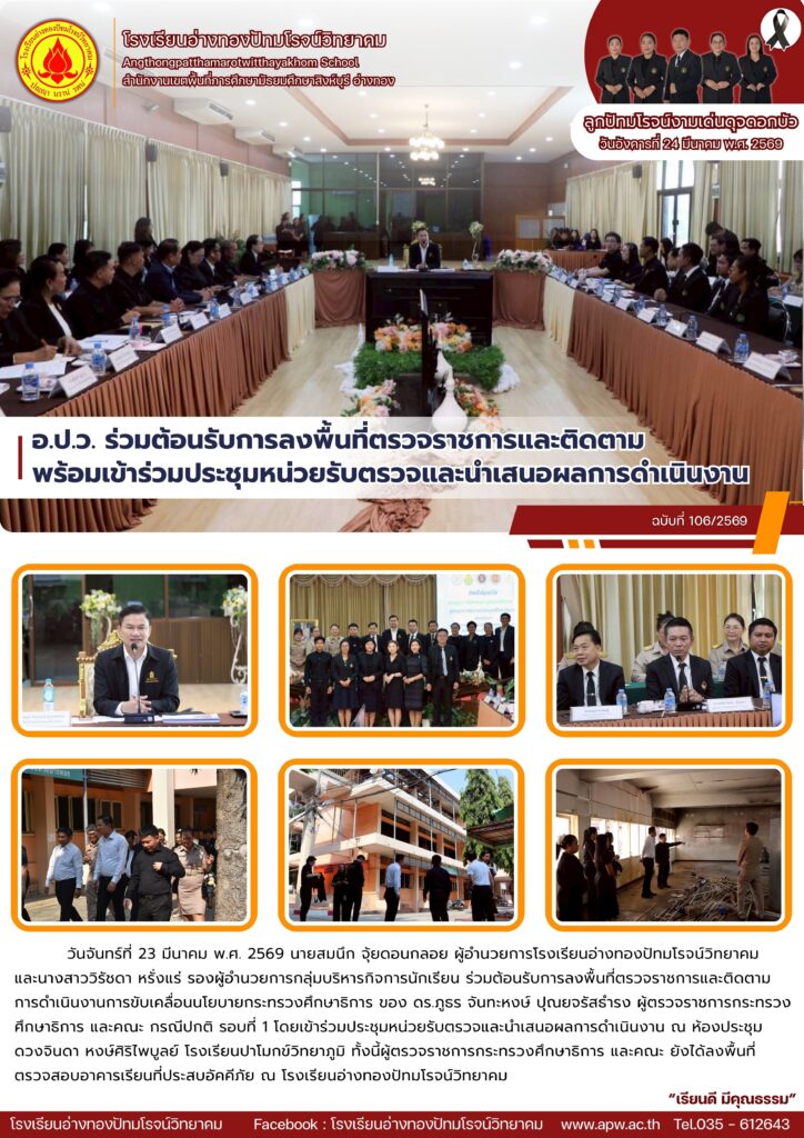 วันจันทร์ที่ 23 มีนาคม พ.ศ. 2569 นายสมนึก จุ้ยดอนกลอย ผู้อำนวยการโรงเรียนอ่างทองปัทมโรจน์วิทยาคม และนางสาววิรัชดา หรั่งแร่ รองผู้อำนวยการกลุ่มบริหารกิจการนักเรียน ร่วมต้อนรับการลงพื้นที่ตรวจราชการและติดตามการดำเนินงานการขับเคลื่อนนโยบายกระทรวงศึกษาธิการ ของ ดร.ภูธร จันทะหงษ์ ปุณยจรัสธํารง ผู้ตรวจราชการกระทรวงศึกษาธิการ และคณะ กรณีปกติ รอบที่ 1 โดยเข้าร่วมประชุมหน่วยรับตรวจและนำเสนอผลการดำเนินงาน ณ ห้องประชุมดวงจินดา หงษ์ศิริไพบูลย์ โรงเรียนปาโมกข์วิทยาภูมิ ทั้งนี้ผู้ตรวจราชการกระทรวงศึกษาธิการ และคณะ ยังได้ลงพื้นที่ตรวจสอบอาคารเรียนที่ประสบอัคคีภัย ณ โรงเรียนอ่างทองปัทมโรจน์วิทยาคม