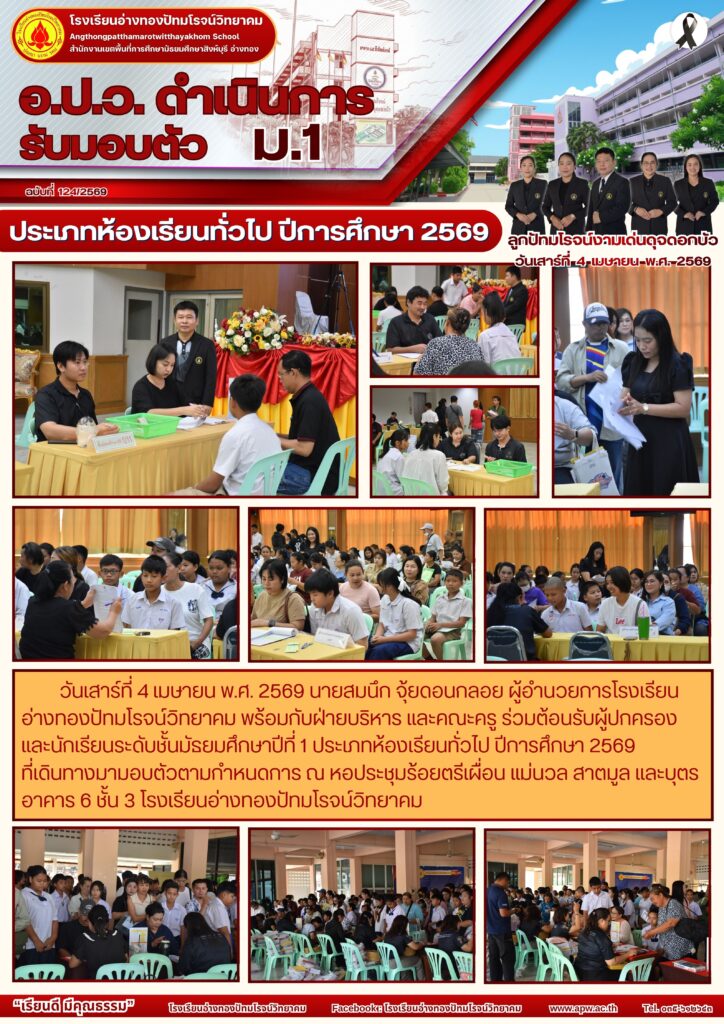 วันเสาร์ที่ 4 เมษายน พ.ศ. 2569 นายสมนึก จุ้ยดอนกลอย ผู้อำนวยการโรงเรียนอ่างทองปัทมโรจน์วิทยาคม พร้อมกับฝ่ายบริหาร และคณะครู ร่วมต้อนรับผู้ปกครองและนักเรียนระดับชั้นมัธยมศึกษาปีที่ 1 ประเภทห้องเรียนทั่วไป ปีการศึกษา 2569 ที่เดินทางมามอบตัวตามกำหนดการ ณ หอประชุมร้อยตรีเผื่อน แม่นวล สาตมูล และบุตร อาคาร 6 ชั้น 3 โรงเรียนอ่างทองปัทมโรจน์วิทยาคม