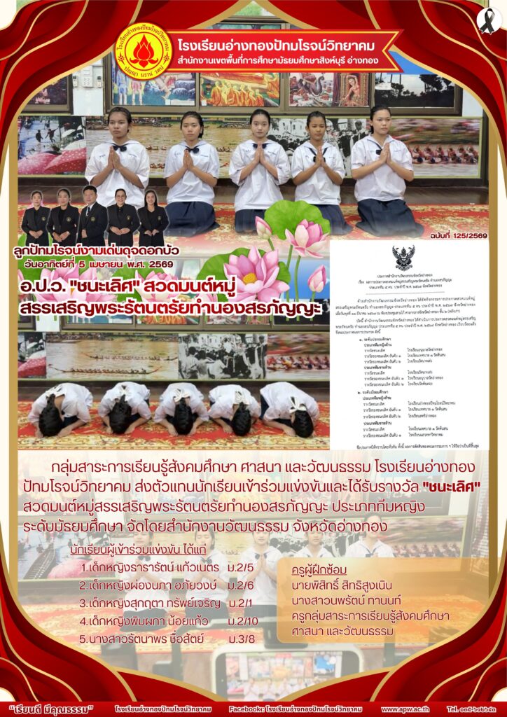 กลุ่มสาระการเรียนรู้สังคมศึกษา ศาสนา และวัฒนธรรม โรงเรียนอ่างทองปัทมโรจน์วิทยาคม ส่งตัวแทนนักเรียนเข้าร่วมแข่งขันและได้รับรางวัล “ชนะเลิศ” สวดมนต์หมู่สรรเสริญพระรัตนตรัยทำนองสรภัญญะ ประเภททีมหญิงระดับมัธยมศึกษา จัดโดยสำนักงานวัฒนธรรม จังหวัดอ่างทอง นักเรียนผู้เข้าร่วมแข่งขัน ได้แก่