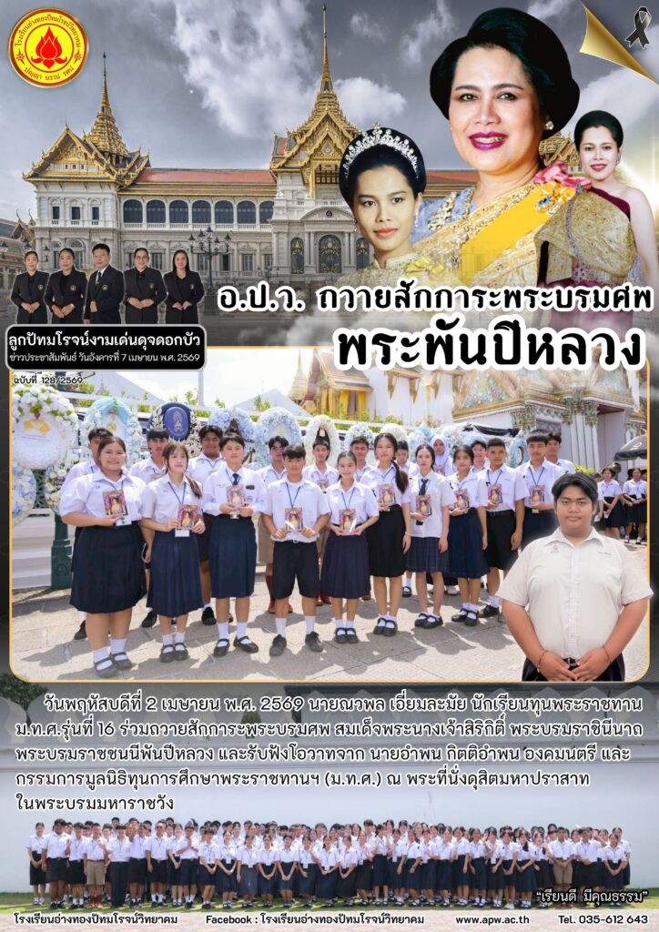 วันพฤหัสบดีที่ 2 เมษายน พ.ศ.2569 นายณวพล เอี่ยมละมัย นักเรียนทุนพระราชทาน ม.ท.ศ.รุ่นที่ 16ร่วมถวายสักการะพระบรมศพ สมเด็จพระนางเจ้าสิริกิติ์ พระบรมราชินีนาถ พระบรมราชชนนีพันปีหลวง และรับฟังโอวาทจาก นายอำพน กิตติอำพน องคมนตรี และกรรมการมูลนิธิทุนการศึกษาพระราชทานฯ (ม.ท.ศ.) ณ พระที่นั่งดุสิตมหาปราสาท ในพระบรมมหาราชวัง