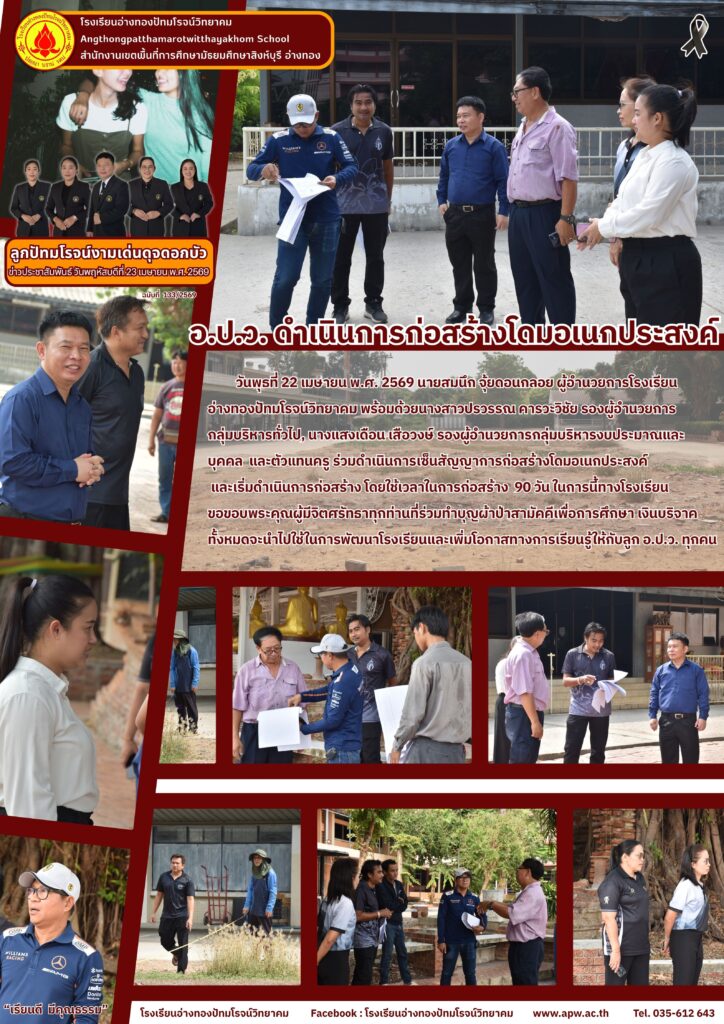 วันพุธที่ 22 เมษายน พ.ศ. 2569 นายสมนึก จุ้ยดอนกลอย ผู้อำนวยการโรงเรียนอ่างทองปัทมโรจน์วิทยาคม พร้อมด้วยนางสาวปรวรรณ คารวะวิชัย รองผู้อำนวยการกลุ่มบริหารทั่วไป, นางแสงเดือน เสือวงษ์ รองผู้อำนวยการกลุ่มบริหารงบประมาณและบุคคล และตัวแทนครู ร่วมดำเนินการเซ็นสัญญาการก่อสร้างโดมอเนกประสงค์และเริ่มดำเนินการก่อสร้าง โดยใช้เวลาในการก่อสร้าง 90 วัน ในการนี้ทางโรงเรียนขอขอบพระคุณผู้มีจิตศรัทธาทุกท่านที่ร่วมทำบุญผ้าป่าสามัคคีเพื่อการศึกษา เงินบริจาคทั้งหมดจะนำไปใช้ในการพัฒนาโรงเรียนและเพิ่มโอกาสทางการเรียนรู้ให้กับลูก อ.ป.ว. ทุกคน
