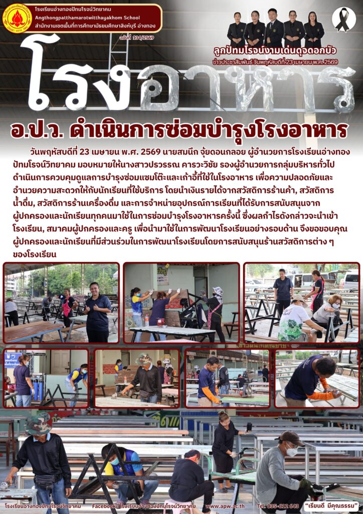 วันพฤหัสบดีที่ 23 เมษายน พ.ศ. 2569 นายสมนึก จุ้ยดอนกลอย ผู้อำนวยการโรงเรียนอ่างทองปัทมโรจน์วิทยาคม มอบหมายให้นางสาวปรวรรณ คารวะวิชัย รองผู้อำนวยการกลุ่มบริหารทั่วไป ดำเนินการควบคุมดูแลการบำรุงซ่อมแซมโต๊ะและเก้าอี้ที่ใช้ในโรงอาหาร เพื่อความปลอดภัยและอำนวยความสะดวกให้กับนักเรียนที่ใช้บริการ โดยนำเงินรายได้จากสวัสดิการร้านค้า, สวัสดิการน้ำดื่ม, สวัสดิการร้านเครื่องดื่ม และการจำหน่ายอุปกรณ์การเรียนที่ได้รับการสนับสนุนจากผู้ปกครองและนักเรียนทุกคนมาใช้ในการซ่อมบำรุงโรงอาหารครั้งนี้ ซึ่งผลกำไรดังกล่าวจะนำเข้าโรงเรียน, สมาคมผู้ปกครองและครู เพื่อนำมาใช้ในการพัฒนาโรงเรียนอย่างรอบด้าน จึงขอขอบคุณผู้ปกครองและนักเรียนที่มีส่วนร่วมในการพัฒนาโรงเรียนโดยการสนับสนุนร้านสวัสดิการต่าง ๆ ของโรงเรียน