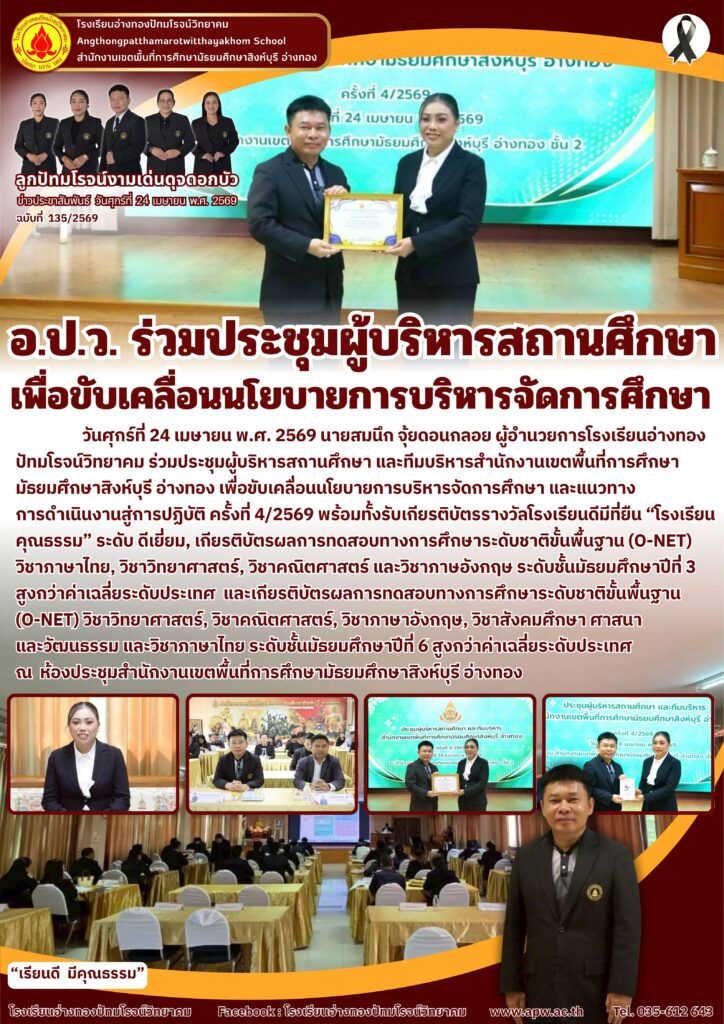 วันศุกร์ที่ 24 เมษายน พ.ศ. 2569 นายสมนึก จุ้ยดอนกลอย ผู้อำนวยการโรงเรียนอ่างทองปัทมโรจน์วิทยาคม ร่วมประชุมผู้บริหารสถานศึกษา และทีมบริหารสำนักงานเขตพื้นที่การศึกษามัธยมศึกษาสิงห์บุรี อ่างทอง เพื่อขับเคลื่อนนโยบายการบริหารจัดการศึกษา และแนวทางการดำเนินงานสู่การปฏิบัติ ครั้งที่ 4/2569 พร้อมทั้งรับเกียรติบัตรรางวัลโรงเรียนดีมีที่ยืน “โรงเรียนคุณธรรม” ระดับ ดีเยี่ยม, เกียรติบัตรผลการทดสอบทางการศึกษาระดับชาติขั้นพื้นฐาน (o-net) วิชาภาษาไทย, วิชาวิทยาศาสตร์, วิชาคณิตศาสตร์ และวิชาภาษอังกฤษ ระดับชั้นมัธยมศึกษาปีที่ 3 สูงกว่าค่าเฉลี่ยระดับประเทศ และเกียรติบัตรผลการทดสอบทางการศึกษาระดับชาติขั้นพื้นฐาน (o-net) วิชาวิทยาศาสตร์, วิชาคณิตศาสตร์, วิชาภาษาอังกฤษ, วิชาสังคมศึกษา ศาสนา และวัฒนธรรม และวิชาภาษาไทย ระดับชั้นมัธยมศึกษาปีที่ 6 สูงกว่าค่าเฉลี่ยระดับประเทศ ณ ห้องประชุมสำนักงานเขตพื้นที่การศึกษามัธยมศึกษาสิงห์บุรี อ่างทอง