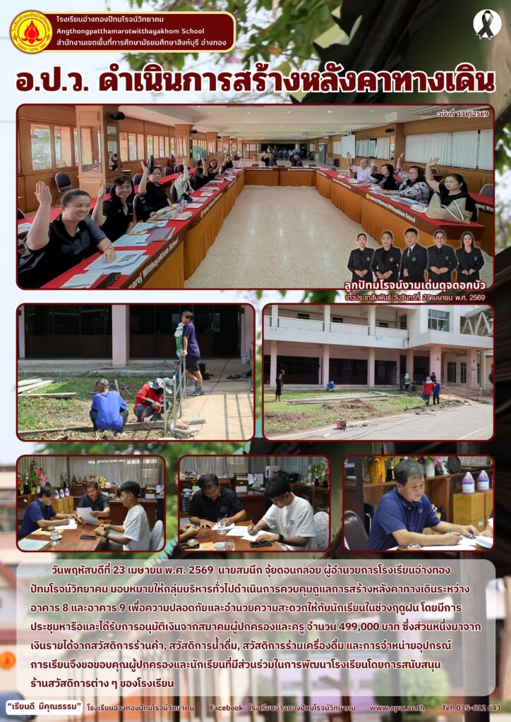 วันพฤหัสบดีที่ 23 เมษายน พ.ศ. 2569 นายสมนึก จุ้ยดอนกลอย ผู้อำนวยการโรงเรียนอ่างทองปัทมโรจน์วิทยาคม มอบหมายให้กลุ่มบริหารทั่วไปดำเนินการควบคุมดูแลการสร้างหลังคาทางเดินระหว่างอาคาร 8 และอาคาร 9 เพื่อความปลอดภัยและอำนวยความสะดวกให้กับนักเรียนในช่วงฤดูฝน โดยมีการประชุมหารือและได้รับการอนุมัติเงินจากสมาคมผู้ปกครองและครู จำนวน 499,000 บาท ซึ่งส่วนหนึ่งมาจากเงินรายได้จากสวัสดิการร้านค้า, สวัสดิการน้ำดื่ม, สวัสดิการร้านเครื่องดื่ม และการจำหน่ายอุปกรณ์การเรียนจึงขอขอบคุณผู้ปกครองและนักเรียนที่มีส่วนร่วมในการพัฒนาโรงเรียนโดยการสนับสนุนร้านสวัสดิการต่าง ๆ ของโรงเรียน